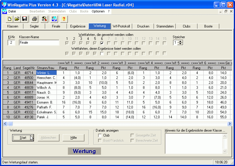Wertung der MO-Final-Wettfahrt: In diesem Beispiel wurde die 6. Wettfahrt als Finale